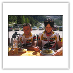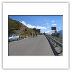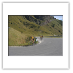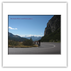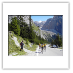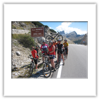 Am vierten Tag ging es zum Passo di Giau, unserer Königsetappe. Es war jeder gespannt, was ihn erwartete. Hatte man die bis jetzt schon gefahrenen Pässe noch aus früheren Touren in Erinnerung, war dieser Pass für alle unbekannt. Bei herrlichem Sonnenschein ging es Richtung Falzarego, doch nach Andraz kam der Abzweig zum Col Santa Lucia und bei Selva di Cadore begann die Auffahrt zum Passo di Giau. 2233m. Steigungen bis 14% mussten überwunden werden, die aber von allen, auch von unseren beiden Damen mit Bravour bewältigt wurden. Den Lohn für diese Anstrengungen erhält man dann natürlich auf der Passhöhe. Hier suchten wir uns ein windstilles Plätzchen und wurden dann von unserem Begleiter Günter verwöhnt, der unterwegs Vesper eingekauft hatte. Ohne ihn wäre nicht alles so durchführbar gewesen, denn auf den Passhöhen, die alle über 2000m hoch waren, ist wärmere Kleidung für die Abfahrten notwendig, die man nicht alle im Trikot mitnehmen kann. In diesen Regionen herrschen schon andere Gesetze wie zu Hause. Über eine herrliche gute Straße mit unendlichen Kehren streiften wir fast Cortina di Ampezzo. Weiter über den Falzaregopass waren wir nach 76 km und über 2000 Hm zurück in Arabba.