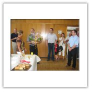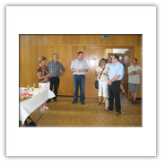 Es ist immer wieder eine Freude unsere Gäste zu empfangen und zu verwöhnen. Und dass man sich auch unterhalten konnte, dafür sorgten unsere Dolmetscher Isabell, Erich, Antoinette und Helmut. Sehr überrascht waren wir als uns gemeldet wurde, dass sieben Rennradfahrer mit dem Rennrad von Raon L' Etape nach Kuppenheim fahren wollten, denn dies war bis jetzt einzigartig. Die Radsportfreunde aus Kuppenheim ließen es sich nicht nehmen ihre Freunde am Grenzübergang Gamsheim abzuholen und nach Kuppenheim zu begleiteten, die dann nach 165 km mit viel Beifall an der Wörtelhalle empfangen wurden. Die Gruppe, die mit dem Bus aus Raon L' Etape angereist war, ging nachdem sie von den Radsportfreunden aus Kuppenheim empfangen wurde und sich nochmals mit Kaffee und Kuchen gestärkt hatte, zu einem Besuch in das Heimatmuseum nach Michelbach. Pünktlich um 14:00 Uhr begann dann der offizielle Teil dieses Treffens. Wir waren sehr erfreut, dass unser Bürgermeister Herr Mußler mit Gattin und Kindern erschien, um unsere Gäste aus Raon L' Etappe zu begrüßen.