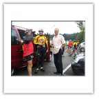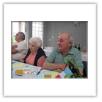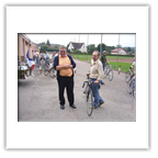 Im Salle Beauregard wurden wir herzlichst empfangen und von den Bürgermeistern Monsieur Humpert und Herrn Mußler begrüßt. Bei dieser Gelegenheit überreichte Reinhard Lehre dem ehemaligen Präsidenten des Radclubs Raon L' Etape und immer noch radsportbegeisterten Ehepaar Monsieur und Madame Ideaux ein kleines Präsent zum 60-jährigen Ehejubiläum. Die beiden lassen es sich nicht nehmen, bei unseren Besuchen in Raon dabei zu sein. Besonders hat es uns gefreut, dass sie uns oben auf dem Col du Donon erwarteten und uns mit dem PKW bis Raon begleiteten. Danach nahmen uns die Raoneser Radsportfreunde in Beschlag.